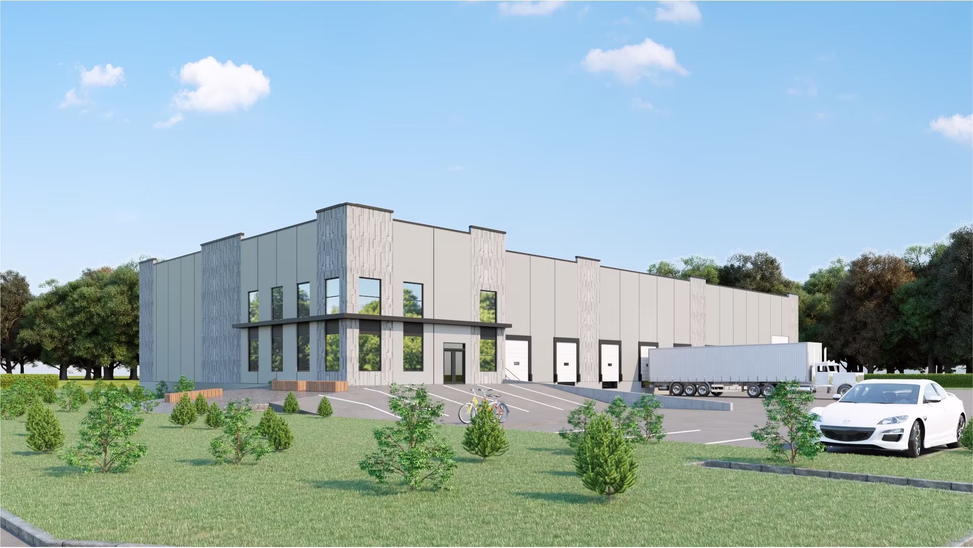 This project found significant cost savings by eliminating all structural steel and using Load-bearing precast concrete wall, still achieving an A Class industrial development. To accommodate the driveway location Azimuth lowered the building 2’, reducing the amount of fill required and less foundation wall. With these savings we added Hydronic Heating to the semi-trailer ramp down apron, allowing for snow free conditions all winter long. This design will use a functionally creative design, with investment-grade quality, this design will have high ceilings combined with dock and ramp up loading, LED lighting, tall façade window glazing, turnkey construction and full ESFR sprinkler system.